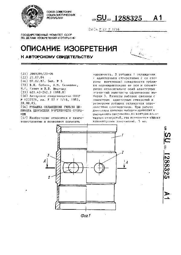 Рубашка охлаждения гильзы цилиндра двигателя внутреннего сгорания / Соболь В. Н., Скаженик А. М., Галян В. Г., Шматько В. В. // Описания изобретений (ретрофонд) / Комитет по патентам и товарным знакам России. – М., 2003. – 1987, № 1. — (Патенты России). — Загл. с титул. экрана. — Поисковая система: MIMOSA GTI. — Систем. требования: Acrobat Reader. — Режим доступа: ftp://smolensklib.ru/bd/patent_ru/pt1288325.pdf. — <URL:ftp://smolensklib.ru/bd/patent_ru/pt1288325.pdf>.
