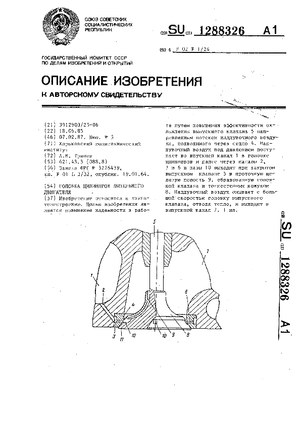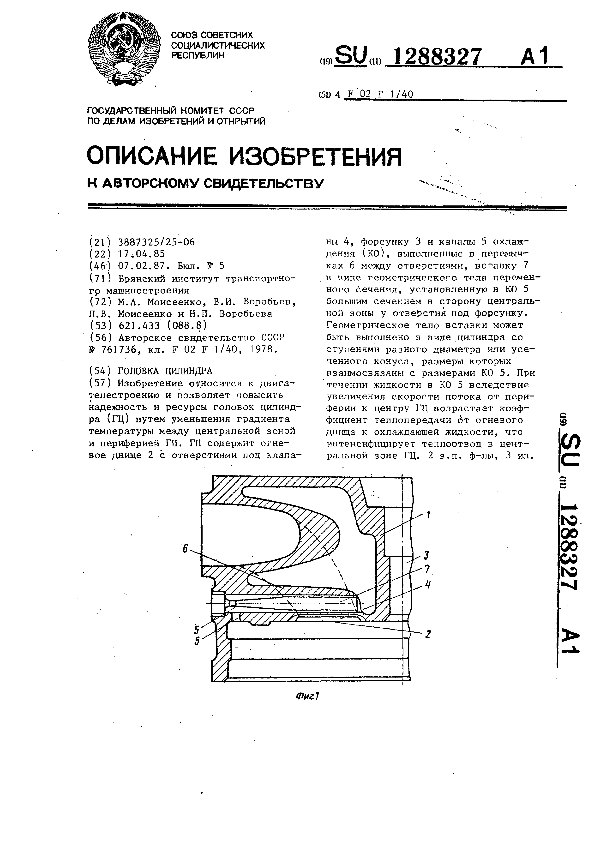 Головка цилиндра / Моисеенко М. А., Воробьев В. И., Моисеенко Л. В., Воробьева Н. П.; заявитель: Брянский институт транспортного машиностроения // Описания изобретений (ретрофонд) / Комитет по патентам и товарным знакам России. – М., 2003. – 1987, № 1. — (Патенты России). — Загл. с титул. экрана. — Поисковая система: MIMOSA GTI. — Систем. требования: Acrobat Reader. — Режим доступа: ftp://smolensklib.ru/bd/patent_ru/pt1288327.pdf. — <URL:ftp://smolensklib.ru/bd/patent_ru/pt1288327.pdf>.