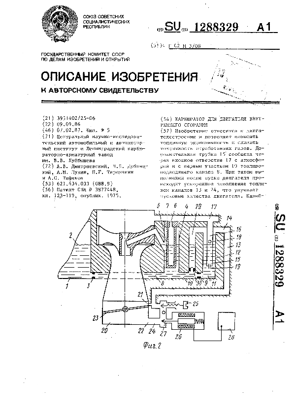 Карбюратор для двигателя внутреннего сгорания / Дмитриевский А. В., Дубницкий Н. Б., Лукин А. М. [и др.]; заявитель: Центральный научно-исследовательский автомобильный и автомоторный институт, Ленинградский карбюраторно-арматурный завод им. В. В. Куйбышева // Описания изобретений (ретрофонд) / Комитет по патентам и товарным знакам России. – М., 2003. – 1987, № 1. — (Патенты России). — Загл. с титул. экрана. — Поисковая система: MIMOSA GTI. — Систем. требования: Acrobat Reader. — Режим доступа: ftp://smolensklib.ru/bd/patent_ru/pt1288329.pdf. — <URL:ftp://smolensklib.ru/bd/patent_ru/pt1288329.pdf>.