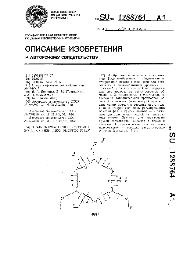 Трансформаторное устройство для связи двух энергосистем / Бошняга В. А., Постолатий В. М., Войтовский А. В.; заявитель: Отдел энергетической кибернетики АН МССР // Описания изобретений (ретрофонд) / Комитет по патентам и товарным знакам России. – М., 2003. – 1987, № 1. — (Патенты России). — Загл. с титул. экрана. — Систем. требования: Acrobat Reader. — Режим доступа: ftp://smolensklib.ru/bd/patent_ru/pt1288764.pdf. — <URL:ftp://smolensklib.ru/bd/patent_ru/pt1288764.pdf>.