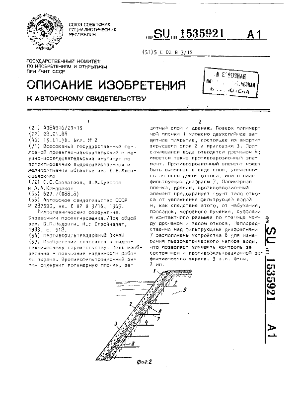 Противофильтрационный экран / Савватеев С. С., Суворов В. А., Кондраков А. А.; заявитель: Всесоюзный государственный головной проектно-изыскательский и научно-исследовательский институт по проектированию водохозяйственных и мелиоративных объектов им. Е. Е. Алексеевского // Описания изобретений (ретрофонд) / Комитет по патентам и товарным знакам России. – М., 2003. – 1990, 1. — (Патенты России). — Загл. с титул. экрана. — Систем. требования: Acrobat Reader. — Режим доступа: ftp://smolensklib.ru/bd/patent_ru/pt1535921.pdf. — <URL:ftp://smolensklib.ru/bd/patent_ru/pt1535921.pdf>.