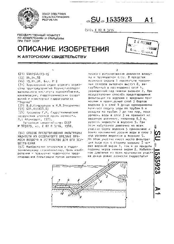 Способ предотвращения фильтрации жидкости из содержащего вредные примеси водоема и устройство для его осуществления / Кондратьев В. Ф., Захарченко И. В.; заявитель: Харьковский отдел водного хозяйства промпредприятий Научно-исследовательского института водоснабжения, канализации, гидротехнических сооружений и инженерной гидрогеологии "Водгео" // Описания изобретений (ретрофонд) / Комитет по патентам и товарным знакам России. – М., 2003. – 1990, 1. — (Патенты России). — Загл. с титул. экрана. — Систем. требования: Acrobat Reader. — Режим доступа: ftp://smolensklib.ru/bd/patent_ru/pt1535923.pdf. — <URL:ftp://smolensklib.ru/bd/patent_ru/pt1535923.pdf>.