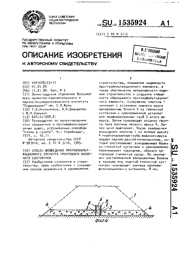 Способ возведения противофильтрационного элемента грунтового напорного сооружения / Игольников Г. А., Давиденко В. М., Хорьков В. И.; заявитель: Ленинградское отделение Всесоюзного проектно-изыскательского и научно-исследовательского института "Гидропроект" им. С. Я. Жука // Описания изобретений (ретрофонд) / Комитет по патентам и товарным знакам России. – М., 2003. – 1990, 1. — (Патенты России). — Загл. с титул. экрана. — Систем. требования: Acrobat Reader. — Режим доступа: ftp://smolensklib.ru/bd/patent_ru/pt1535924.pdf. — <URL:ftp://smolensklib.ru/bd/patent_ru/pt1535924.pdf>.