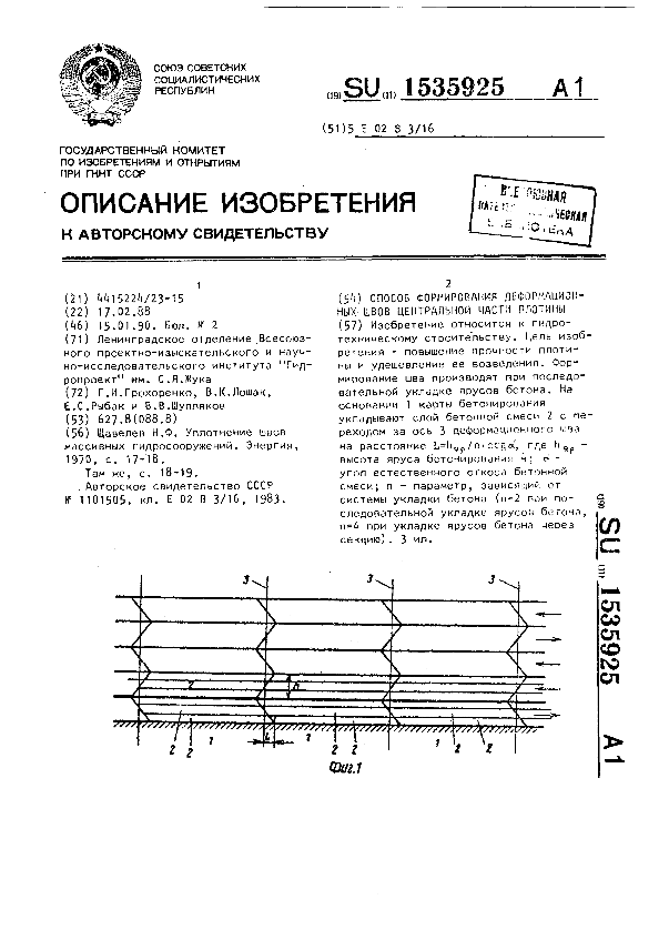 Способ формирования деформационных швов центральной части плотины / Прохоренко Г. И., Лошак В. К., Рыбак Е. С., Шупляков В. В.; заявитель: Ленинградское отделение Всесоюзного проектно-изыскательского и научно-исследовательского института "Гидропроект" им. С. Я. Жука // Описания изобретений (ретрофонд) / Комитет по патентам и товарным знакам России. – М., 2003. – 1990, 1. — (Патенты России). — Загл. с титул. экрана. — Систем. требования: Acrobat Reader. — Режим доступа: ftp://smolensklib.ru/bd/patent_ru/pt1535925.pdf. — <URL:ftp://smolensklib.ru/bd/patent_ru/pt1535925.pdf>.
