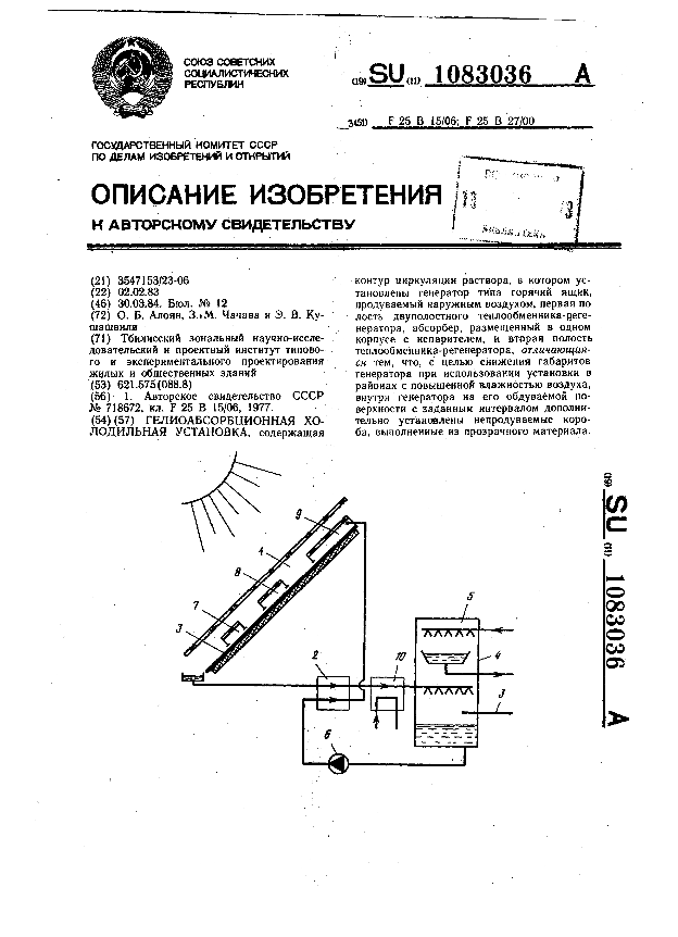Гелиоабсорбционная холодильная установка / Алоян О. Б., Чачава З. М., Кушашвили Э. В.; заявитель : Тбилисский зональный научно-исследовательский и проектный институт типового и экспериментального проектирования жилых и общественных зданий // Описания изобретений (ретрофонд) / Комитет по патентам и товарным знакам России. – М. — (Патенты России)., 2003. – 1984, № 1. — Загл. с титул. экрана. — Поисковая система: ИПС MIMOSA GTI. — Систем. требования: Acrobat Reader. — Режим доступа: ftp://smolensklib.ru/bd/patent_ru/pt1083036.pdf. — <URL:ftp://smolensklib.ru/bd/patent_ru/pt1083036.pdf>.