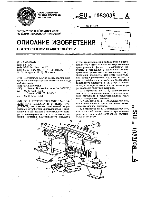 Устройство для замораживания жидких и вязких продуктов / Баранов О. А., Бережная Л. И., Марук М. М., Поляков И. Д.; заявитель : Всесоюзный научно-исследовательский проектно-конструкторский институт прикладной биохимии // Описания изобретений (ретрофонд) / Комитет по патентам и товарным знакам России. – М. — (Патенты России)., 2003. – 1984, № 1. — Загл. с титул. экрана. — Поисковая система: ИПС MIMOSA GTI. — Систем. требования: Acrobat Reader. — Режим доступа: ftp://smolensklib.ru/bd/patent_ru/pt1083038.pdf. — <URL:ftp://smolensklib.ru/bd/patent_ru/pt1083038.pdf>.