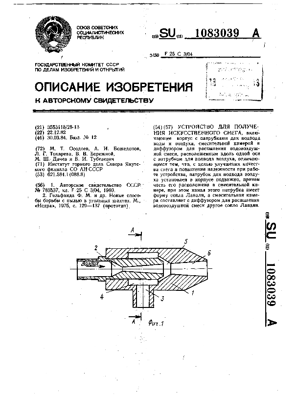 Устройство для получения искусственного снега / Осодоев М. Т., Божедонов А. И., Токарева Л. Г. [и др.]; заявитель : Институт горного дела Севера Якутского филиала СО АН СССР // Описания изобретений (ретрофонд) / Комитет по патентам и товарным знакам России. – М. — (Патенты России)., 2003. – 1984, № 1. — Загл. с титул. экрана. — Поисковая система: ИПС MIMOSA GTI. — Систем. требования: Acrobat Reader. — Режим доступа: ftp://smolensklib.ru/bd/patent_ru/pt1083039.pdf. — <URL:ftp://smolensklib.ru/bd/patent_ru/pt1083039.pdf>.