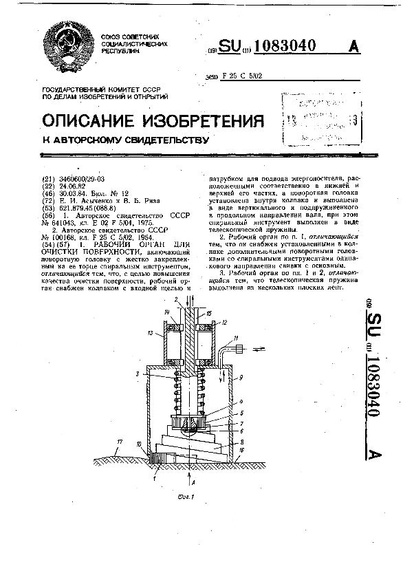 Рабочий орган для очистки поверхности / Асыченко Е. И., Риза В. Б. // Описания изобретений (ретрофонд) / Комитет по патентам и товарным знакам России. – М. — (Патенты России)., 2003. – 1984, № 1. — Загл. с титул. экрана. — Поисковая система: ИПС MIMOSA GTI. — Систем. требования: Acrobat Reader. — Режим доступа: ftp://smolensklib.ru/bd/patent_ru/pt1083040.pdf. — <URL:ftp://smolensklib.ru/bd/patent_ru/pt1083040.pdf>.
