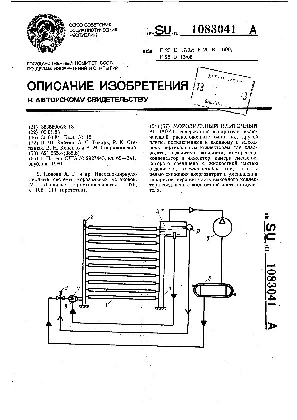 Морозильный плиточный аппарат / Хайтин Б. Ш., Токарь А. С., Степанюк Р. К. [и др.] // Описания изобретений (ретрофонд) / Комитет по патентам и товарным знакам России. – М. — (Патенты России)., 2003. – 1984, № 1. — Загл. с титул. экрана. — Поисковая система: ИПС MIMOSA GTI. — Систем. требования: Acrobat Reader. — Режим доступа: ftp://smolensklib.ru/bd/patent_ru/pt1083041.pdf. — <URL:ftp://smolensklib.ru/bd/patent_ru/pt1083041.pdf>.