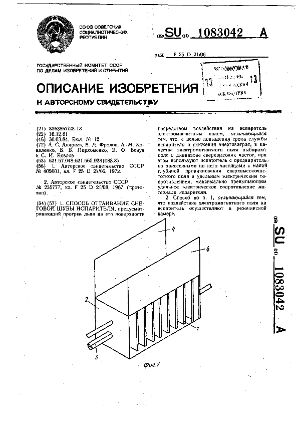 Способ оттаивания снеговой шубы испарителя / Андреев А. С., Фролов В. Д., Коваленко А. М. [и др.] // Описания изобретений (ретрофонд) / Комитет по патентам и товарным знакам России. – М. — (Патенты России)., 2003. – 1984, № 1. — Загл. с титул. экрана. — Поисковая система: ИПС MIMOSA GTI. — Систем. требования: Acrobat Reader. — Режим доступа: ftp://smolensklib.ru/bd/patent_ru/pt1083042.pdf. — <URL:ftp://smolensklib.ru/bd/patent_ru/pt1083042.pdf>.