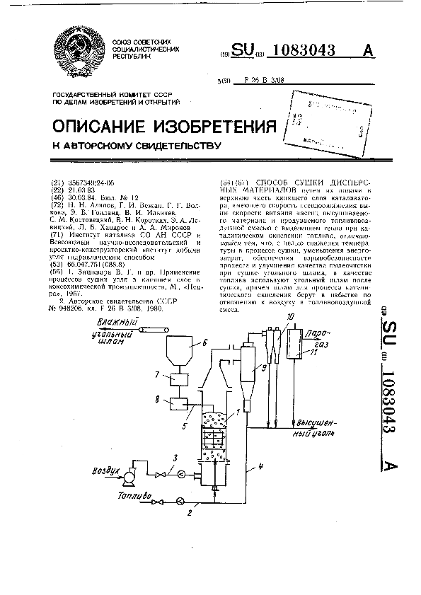 Способ сушки дисперсных материалов / Алипов Н. Н., Вежан Г. И., Волкова Г. Г. [и др.]; заявитель : Институт катализа СО АН СССР, Всесоюзный научно-исследовательский и проектно-конструкторский институт добычи угля гидравлическим способом // Описания изобретений (ретрофонд) / Комитет по патентам и товарным знакам России. – М. — (Патенты России)., 2003. – 1984, № 1. — Загл. с титул. экрана. — Поисковая система: ИПС MIMOSA GTI. — Систем. требования: Acrobat Reader. — Режим доступа: ftp://smolensklib.ru/bd/patent_ru/pt1083043.pdf. — <URL:ftp://smolensklib.ru/bd/patent_ru/pt1083043.pdf>.