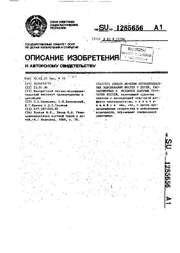 Способ лечения опухолеподобных заболеваний костей у детей, расположенных в метафизе длинных трубчатых костей / Наумович С. С., Козловский С. П., Крючок В. Г., Тесаков Д. К.; заявитель: Белорусский научно-исследовательский институт травматологий и ортопедии // Описания изобретений (ретрофонд) / Комитет по патентам и товарным знакам России. – М., 2003. – 1987, № 1. — (Патенты России). — Загл. с титул. экрана. — Поисковая система: MIMOSA GTI. — Систем. требования: Acrobat Reader. — Режим доступа: ftp://smolensklib.ru/bd/patent_ru/pt1285656.pdf. — <URL:ftp://smolensklib.ru/bd/patent_ru/pt1285656.pdf>.