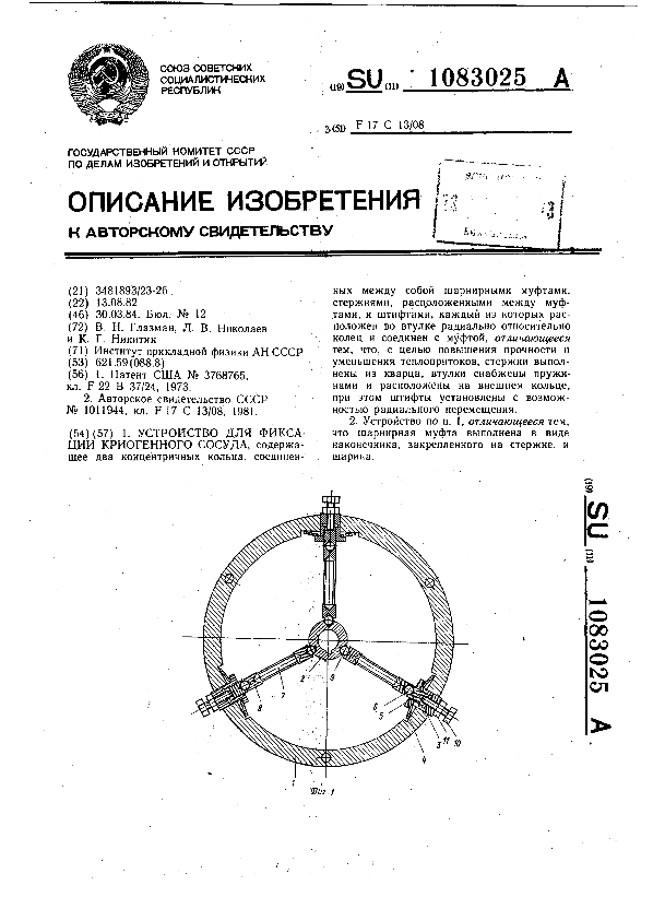 Устройство для фиксации криогенного сосуда / Глазман В. Н., Николаев Л. В., Никитин К. Г.; заявитель : Институт прикладной физики АН СССР // Описания изобретений (ретрофонд) / Комитет по патентам и товарным знакам России. – М. — (Патенты России)., 2003. – 1984, № 1. — Загл. с титул. экрана. — Поисковая система: ИПС MIMOSA GTI. — Систем. требования: Acrobat Reader. — Режим доступа: ftp://smolensklib.ru/bd/patent_ru/pt1083025.pdf. — <URL:ftp://smolensklib.ru/bd/patent_ru/pt1083025.pdf>.
