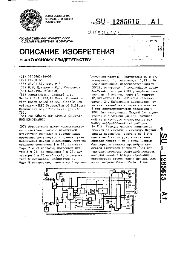 Устройство для приема дискретной информации / Макушев В. Ю., Северилов Ю. Д. // Описания изобретений (ретрофонд) / Комитет по патентам и товарным знакам России. – М., 2003. – 1987, № 1. — (Патенты России). — Загл. с титул. экрана. — Поисковая система: MIMOSA GTI. — Систем. требования: Acrobat Reader. — Режим доступа: ftp://smolensklib.ru/bd/patent_ru/pt1285615.pdf. — <URL:ftp://smolensklib.ru/bd/patent_ru/pt1285615.pdf>.