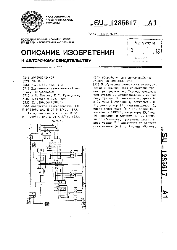 Устройство для приоритетного распределения абонентов / Козлов В. П., Рукоданов Ю. П., Дегтерев А. П., Друзь Л. В.; заявитель: Научно-исследовательский институт интроскопии // Описания изобретений (ретрофонд) / Комитет по патентам и товарным знакам России. – М., 2003. – 1987, № 1. — (Патенты России). — Загл. с титул. экрана. — Поисковая система: MIMOSA GTI. — Систем. требования: Acrobat Reader. — Режим доступа: ftp://smolensklib.ru/bd/patent_ru/pt1285617.pdf. — <URL:ftp://smolensklib.ru/bd/patent_ru/pt1285617.pdf>.