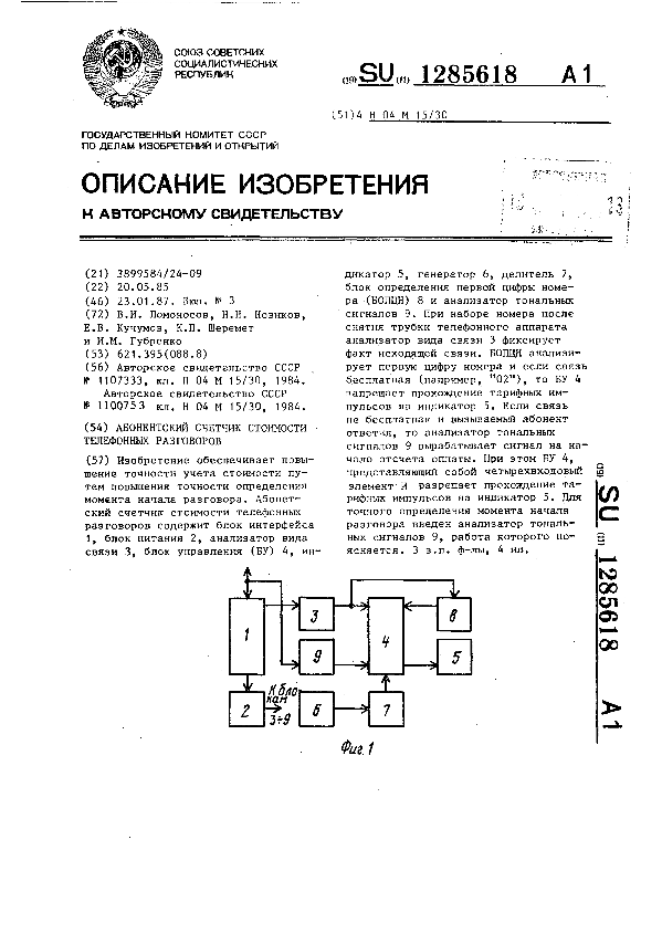 Абонентский счетчик стоимости телефонных разговоров / Ломоносов В. И., Новиков Н. Н., Кучумов Е. В. [и др.] // Описания изобретений (ретрофонд) / Комитет по патентам и товарным знакам России. – М., 2003. – 1987, № 1. — (Патенты России). — Загл. с титул. экрана. — Поисковая система: MIMOSA GTI. — Систем. требования: Acrobat Reader. — Режим доступа: ftp://smolensklib.ru/bd/patent_ru/pt1285618.pdf. — <URL:ftp://smolensklib.ru/bd/patent_ru/pt1285618.pdf>.