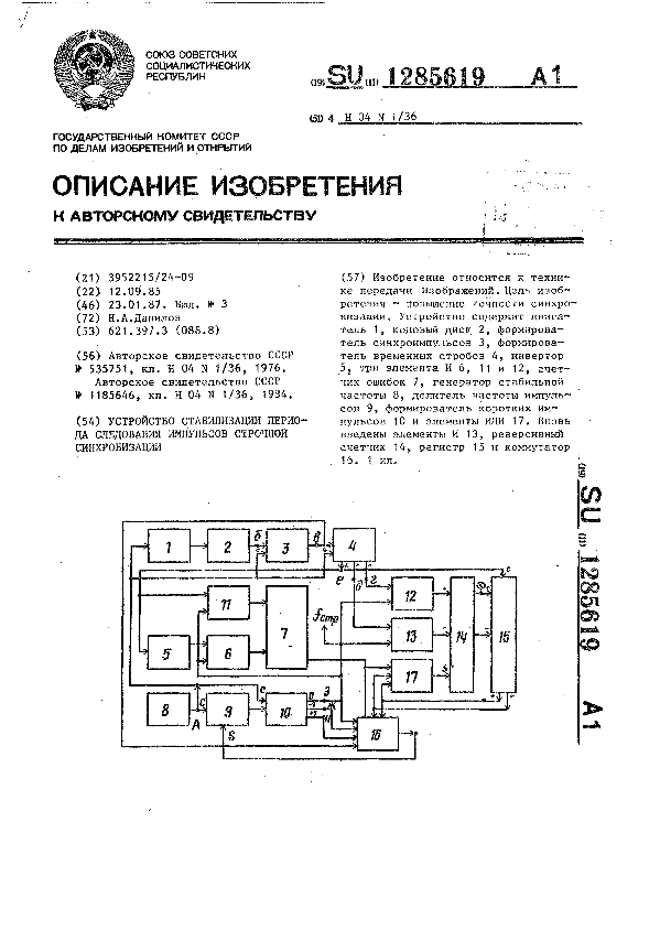 Устройство стабилизации периода следования импульсов строчной синхронизации / Данилов Н. А. // Описания изобретений (ретрофонд) / Комитет по патентам и товарным знакам России. – М., 2003. – 1987, № 1. — (Патенты России). — Загл. с титул. экрана. — Поисковая система: MIMOSA GTI. — Систем. требования: Acrobat Reader. — Режим доступа: ftp://smolensklib.ru/bd/patent_ru/pt1285619.pdf. — <URL:ftp://smolensklib.ru/bd/patent_ru/pt1285619.pdf>.