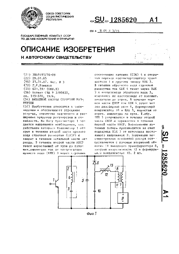Выходной каскад строчной развертки / Романов Г. Е. // Описания изобретений (ретрофонд) / Комитет по патентам и товарным знакам России. – М., 2003. – 1987, № 1. — (Патенты России). — Загл. с титул. экрана. — Поисковая система: MIMOSA GTI. — Систем. требования: Acrobat Reader. — Режим доступа: ftp://smolensklib.ru/bd/patent_ru/pt1285620.pdf. — <URL:ftp://smolensklib.ru/bd/patent_ru/pt1285620.pdf>.