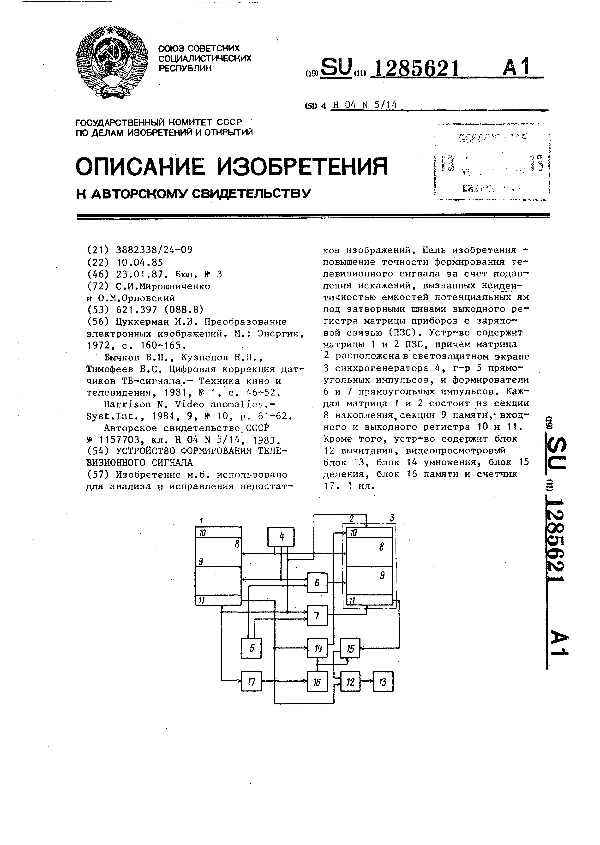 Устройство формирования телевизионного сигнала / Мирошниченко С. И., Орловский О. М. // Описания изобретений (ретрофонд) / Комитет по патентам и товарным знакам России. – М., 2003. – 1987, № 1. — (Патенты России). — Загл. с титул. экрана. — Поисковая система: MIMOSA GTI. — Систем. требования: Acrobat Reader. — Режим доступа: ftp://smolensklib.ru/bd/patent_ru/pt1285621.pdf. — <URL:ftp://smolensklib.ru/bd/patent_ru/pt1285621.pdf>.