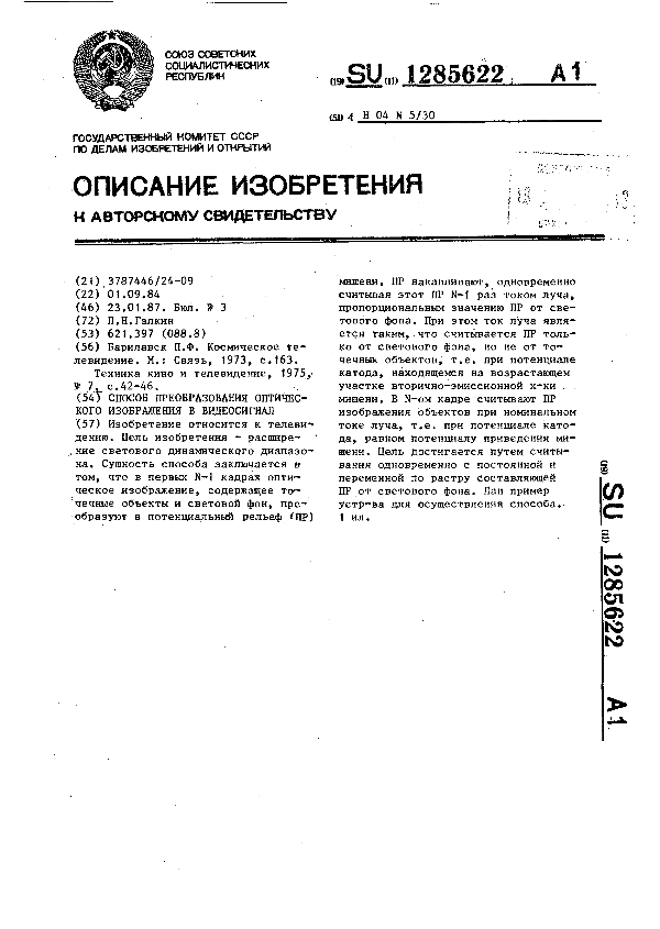 Способ преобразования оптического изображения в видеосигнал / Галкин Л. Н. // Описания изобретений (ретрофонд) / Комитет по патентам и товарным знакам России. – М., 2003. – 1987, № 1. — (Патенты России). — Загл. с титул. экрана. — Поисковая система: MIMOSA GTI. — Систем. требования: Acrobat Reader. — Режим доступа: ftp://smolensklib.ru/bd/patent_ru/pt1285622.pdf. — <URL:ftp://smolensklib.ru/bd/patent_ru/pt1285622.pdf>.