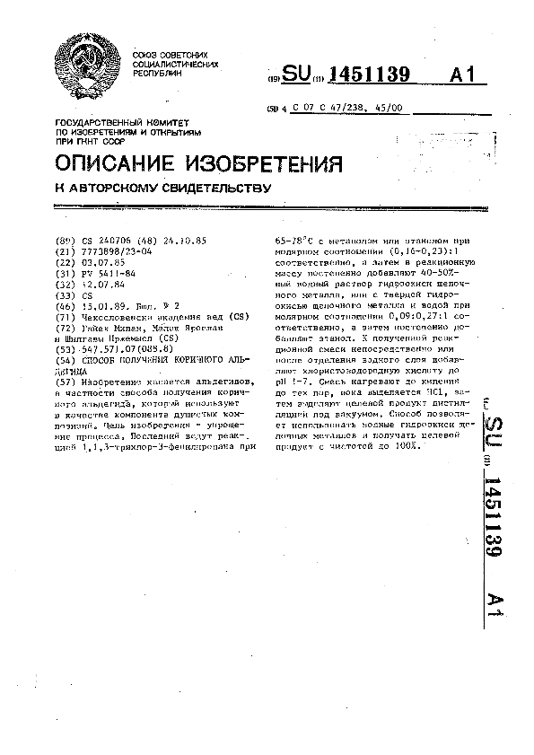 Способ получения коричного альдегида / Гайек Милан, Малек Ярослав, Шилгавы Пржемысл; заявитель: Чехословенска академия вед // Описания изобретений (ретрофонд) / Комитет по патентам и товарным знакам России. – М., 2003. – 1989, № 1. — (Патенты России). — Загл. с титул. экрана. — Поисковая система: ИПС MIMOSA GTI. — Систем. требования: Acrobat Reader. — Режим доступа: ftp://smolensklib.ru/bd/patent_ru/pt1451139.pdf. — <URL:ftp://smolensklib.ru/bd/patent_ru/pt1451139.pdf>.