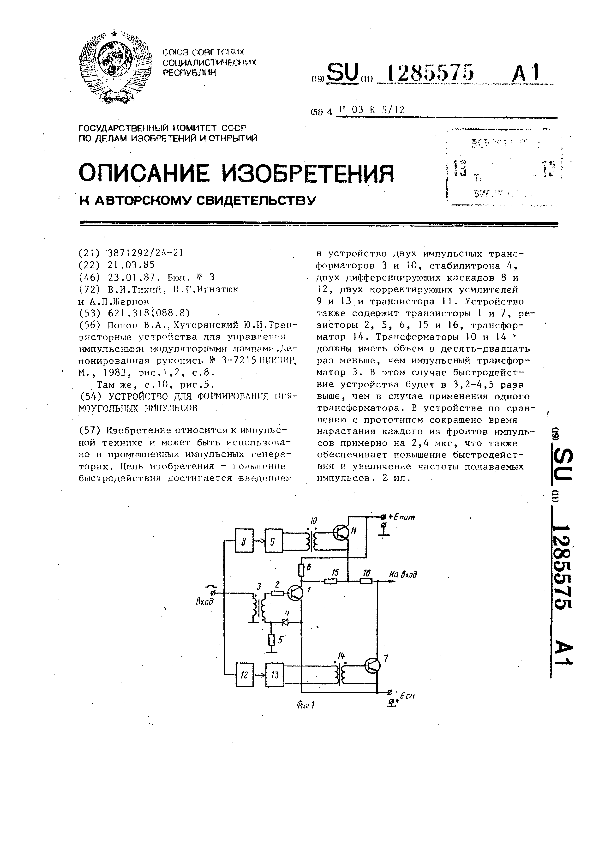 Устройство для формирования прямоугольных импульсов / Тихий В. И., Игнатюк Н. Г., Жернов А. П. // Описания изобретений (ретрофонд) / Комитет по патентам и товарным знакам России. – М., 2003. – 1987, № 1. — (Патенты России). — Загл. с титул. экрана. — Поисковая система: MIMOSA GTI. — Систем. требования: Acrobat Reader. — Режим доступа: ftp://smolensklib.ru/bd/patent_ru/pt1285575.pdf. — <URL:ftp://smolensklib.ru/bd/patent_ru/pt1285575.pdf>.
