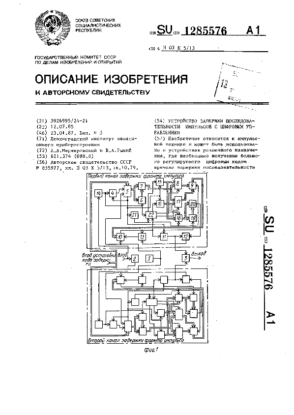 Устройство задержки последовательности импульсов с цифровым управлением / Мержеровский А. А., Рыжий В. А.; заявитель: Ленинградский институт авиационного приборостроения // Описания изобретений (ретрофонд) / Комитет по патентам и товарным знакам России. – М., 2003. – 1987, № 1. — (Патенты России). — Загл. с титул. экрана. — Поисковая система: MIMOSA GTI. — Систем. требования: Acrobat Reader. — Режим доступа: ftp://smolensklib.ru/bd/patent_ru/pt1285576.pdf. — <URL:ftp://smolensklib.ru/bd/patent_ru/pt1285576.pdf>.