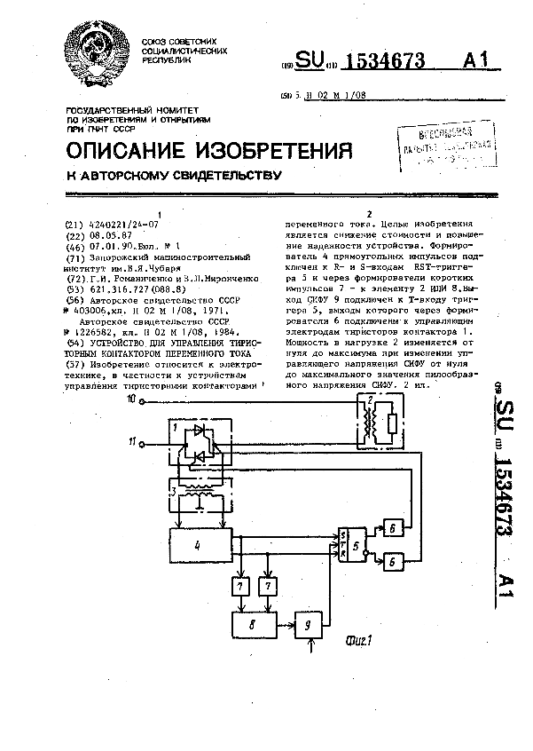 Устройство для управления тиристорным контактором переменного тока / Романиченко Г. Н., Миронченко В. Л.; заявитель: Запорожский машиностроительный институт им. В. Я. Чубаря // Описания изобретений (ретрофонд) / Комитет по патентам и товарным знакам России. – М., 2003. – 1990, № 1. — (Патенты России). — Загл. с титул. экрана. — Поисковая система: MIMOSA GTI. — Систем. требования: Acrobat Reader. — Режим доступа: ftp://smolensklib.ru/bd/patent_ru/pt1534673.pdf. — <URL:ftp://smolensklib.ru/bd/patent_ru/pt1534673.pdf>.