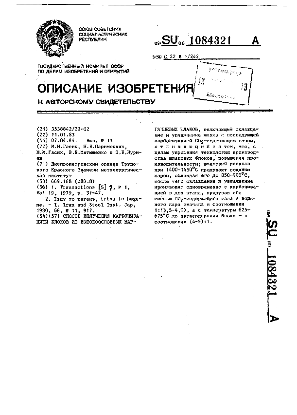 Способ получения карбонизацией блоков из высокоосновных марганцевых шлаков / Гасик М. И., Паримончик И. Б., Гасик М. М. [и др.]; заявитель : Днепропетровский ордена Трудового Красного Знамени металлургический институт // Описания изобретений (ретрофонд) / Комитет по патентам и товарным знакам России. – М. — (Патенты России)., 2003. – 1984, № 1. — Загл. с титул. экрана. — Систем. требования: Acrobat Reader. — Режим доступа: ftp://smolensklib.ru/bd/patent_ru/pt1084321.pdf. — <URL:ftp://smolensklib.ru/bd/patent_ru/pt1084321.pdf>.