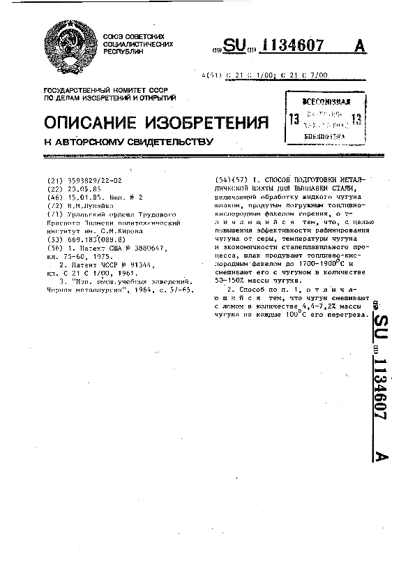 Способ подготовки металлической шихты для выплавки стали / В. М. Лупэйко; заявитель: Уральский ордена Трудового Красного Знамени политехнический институт им. С.М.Кирова // Описания изобретений (ретрофонд) / Комитет по патентам и товарным знакам России. – М., 2003. – 1985, № 1. — (Патенты России). — Загл. с титул. экрана. — Систем. требования: Acrobat Reader. — Режим доступа: ftp://smolensklib.ru/bd/patent_ru/pt1134607.pdf. — <URL:ftp://smolensklib.ru/bd/patent_ru/pt1134607.pdf>.