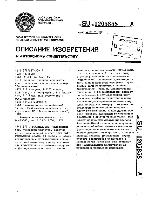 Опрыскиватель / Стабрин Р. В., Ковбасюк В. Я., Ткач Е. Ш. [и др.]; заявитель: Головное специализированное конструкторско-технологическое бюро "Селъхозхиммаш" // Описания изобретений (ретрофонд) / Комитет по патентам и товарным знакам России. – М., 2003. – 1986, № 1. — (Патенты России). — Загл. с титул. экрана. — Поисковая система: ИПС MIMOSA GTI. — Систем. требования: Acrobat Reader. — Режим доступа: ftp://smolensklib.ru/bd/patent_ru/pt1205858.pdf. — <URL:ftp://smolensklib.ru/bd/patent_ru/pt1205858.pdf>.