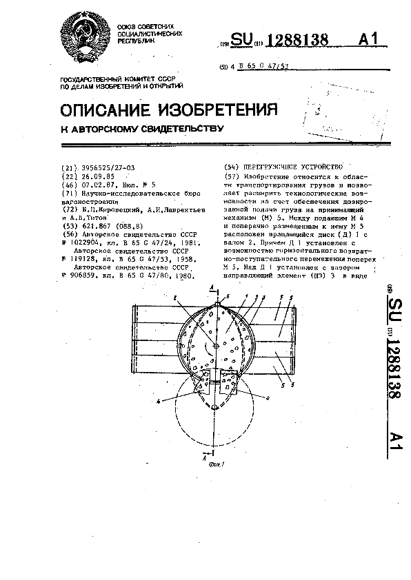 Перегрузочное устройство / Жировецкий Б. Ц., Лаврентьев А. И., Титов А. В.; заявитель: Научно-исследовательское бюро вагоностроения // Описания изобретений (ретрофонд) / Комитет по патентам и товарным знакам России. – М., 2003. – 1987, № 1. — (Патенты России). — Загл. с титул. экрана. — Поисковая система: MIMOSA GTI. — Систем. требования: Acrobat Reader. — Режим доступа: ftp://smolensklib.ru/bd/patent_ru/pt1288138.pdf. — <URL:ftp://smolensklib.ru/bd/patent_ru/pt1288138.pdf>.