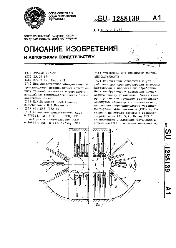 Установка для обработки листовых материалов / Богданов П. И., Фролов И. В., Чистов В. И., Башашкин В. А.; заявитель: Производственное объединение по производству асбоцементных конструкций, термоизоляционных материалов и изделий из технического стекла "Мосасботермостекло" // Описания изобретений (ретрофонд) / Комитет по патентам и товарным знакам России. – М., 2003. – 1987, № 1. — (Патенты России). — Загл. с титул. экрана. — Поисковая система: MIMOSA GTI. — Систем. требования: Acrobat Reader. — Режим доступа: ftp://smolensklib.ru/bd/patent_ru/pt1288139.pdf. — <URL:ftp://smolensklib.ru/bd/patent_ru/pt1288139.pdf>.