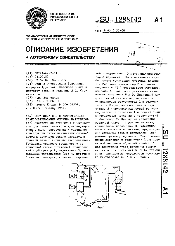 Установка для пневматического транспортирования сыпучих материалов / Верменчук И. П.; заявитель: Ордена Октябрьской Революции и ордена Трудового Красного Знамени институт горного дела им. А. А. Скочинского // Описания изобретений (ретрофонд) / Комитет по патентам и товарным знакам России. – М., 2003. – 1987, № 1. — (Патенты России). — Загл. с титул. экрана. — Поисковая система: MIMOSA GTI. — Систем. требования: Acrobat Reader. — Режим доступа: ftp://smolensklib.ru/bd/patent_ru/pt1288142.pdf. — <URL:ftp://smolensklib.ru/bd/patent_ru/pt1288142.pdf>.