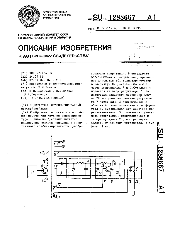 Однотактный стабилизированный преобразователь / Бородулин Ю. Б., Зверев Ю. В., Герасимов Е. Б.; заявитель: Ивановский энергетический институт им. В. И. Ленина // Описания изобретений (ретрофонд) / Комитет по патентам и товарным знакам России. – М., 2003. – 1987, № 1. — (Патенты России). — Загл. с титул. экрана. — Систем. требования: Acrobat Reader. — Режим доступа: ftp://smolensklib.ru/bd/patent_ru/pt1288667.pdf. — <URL:ftp://smolensklib.ru/bd/patent_ru/pt1288667.pdf>.
