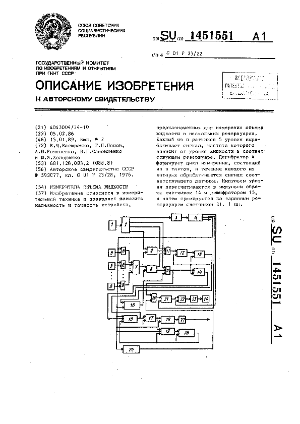 Измеритель объема жидкости / Васюренко В. Д., Попов Г. П., Романенко А. Ю. [и др.] // Описания изобретений (ретрофонд) / Комитет по патентам и товарным знакам России. – М., 2003. – 1989, № 1. — (Патенты России). — Загл. с титул. экрана. — Поисковая система: ИПС MIMOSA GTI. — Систем. требования: Acrobat Reader. — Режим доступа: ftp://smolensklib.ru/bd/patent_ru/pt1451551.pdf. — <URL:ftp://smolensklib.ru/bd/patent_ru/pt1451551.pdf>.