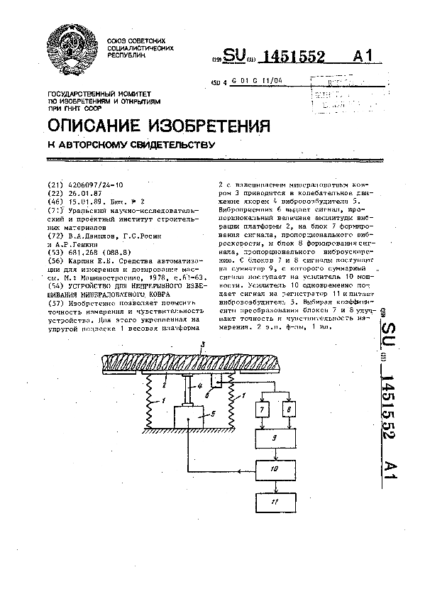 Устройство для непрерывного взвешивания минераловатного ковра / Данилов В. А., Росин Г. С., Генкин А. Р.; заявитель: Уральский научно-исследовательский и проектный институт строительных материалов // Описания изобретений (ретрофонд) / Комитет по патентам и товарным знакам России. – М., 2003. – 1989, № 1. — (Патенты России). — Загл. с титул. экрана. — Поисковая система: ИПС MIMOSA GTI. — Систем. требования: Acrobat Reader. — Режим доступа: ftp://smolensklib.ru/bd/patent_ru/pt1451552.pdf. — <URL:ftp://smolensklib.ru/bd/patent_ru/pt1451552.pdf>.