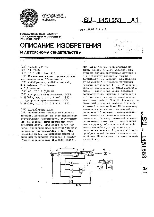 Конвейерные весы / Ерошкин А. С., Никольский А. Б., Кофанов В. А. [и др.]; заявитель: Московское научно-производственное объединение "Измеритель" // Описания изобретений (ретрофонд) / Комитет по патентам и товарным знакам России. – М., 2003. – 1989, № 1. — (Патенты России). — Загл. с титул. экрана. — Поисковая система: ИПС MIMOSA GTI. — Систем. требования: Acrobat Reader. — Режим доступа: ftp://smolensklib.ru/bd/patent_ru/pt1451553.pdf. — <URL:ftp://smolensklib.ru/bd/patent_ru/pt1451553.pdf>.