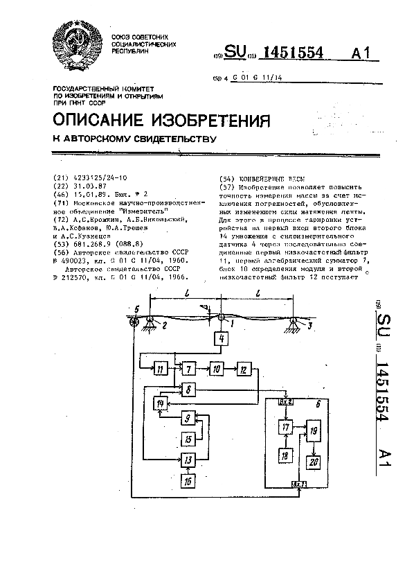 Конвейерные весы / Ерошкин А. С., Никольский А. Б., Кофанов В. А. [и др.]; заявитель: Московское научно-производственное объединение "Измеритель" // Описания изобретений (ретрофонд) / Комитет по патентам и товарным знакам России. – М., 2003. – 1989, № 1. — (Патенты России). — Загл. с титул. экрана. — Поисковая система: ИПС MIMOSA GTI. — Систем. требования: Acrobat Reader. — Режим доступа: ftp://smolensklib.ru/bd/patent_ru/pt1451554.pdf. — <URL:ftp://smolensklib.ru/bd/patent_ru/pt1451554.pdf>.