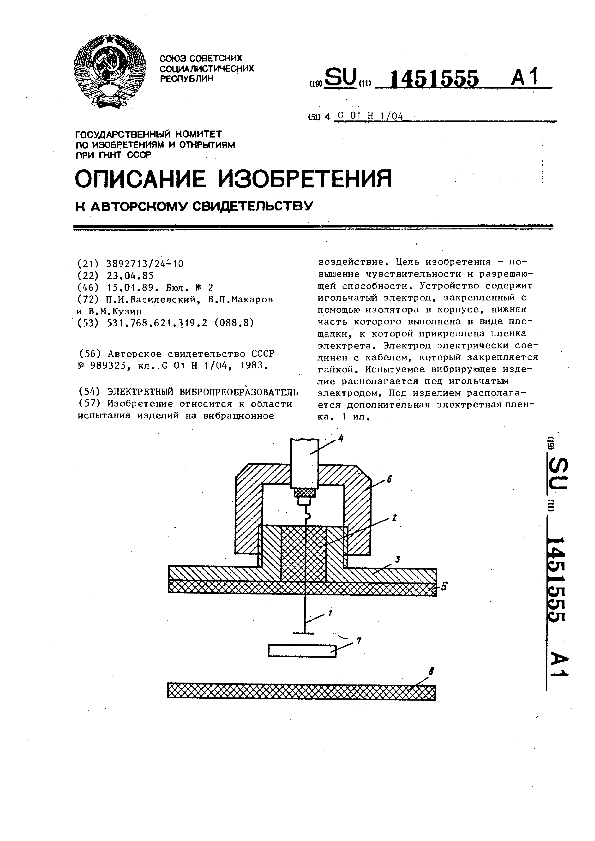 Электретный вибропреобразователь / Василевский П. И., Макаров В. П., Кузин В. М. // Описания изобретений (ретрофонд) / Комитет по патентам и товарным знакам России. – М., 2003. – 1989, № 1. — (Патенты России). — Загл. с титул. экрана. — Поисковая система: ИПС MIMOSA GTI. — Систем. требования: Acrobat Reader. — Режим доступа: ftp://smolensklib.ru/bd/patent_ru/pt1451555.pdf. — <URL:ftp://smolensklib.ru/bd/patent_ru/pt1451555.pdf>.