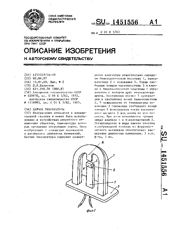 Датчик температуры / Капралов Л. В. // Описания изобретений (ретрофонд) / Комитет по патентам и товарным знакам России. – М., 2003. – 1989, № 1. — (Патенты России). — Загл. с титул. экрана. — Поисковая система: ИПС MIMOSA GTI. — Систем. требования: Acrobat Reader. — Режим доступа: ftp://smolensklib.ru/bd/patent_ru/pt1451556.pdf. — <URL:ftp://smolensklib.ru/bd/patent_ru/pt1451556.pdf>.