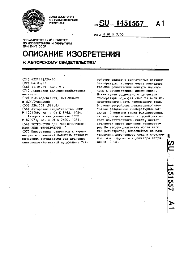 Устройство для многоточечного измерения температуры / Воробкевич В. Ю., Якимец В. Т., Тушницкий М. М.; заявитель: Львовский сельскохозяйственный институт // Описания изобретений (ретрофонд) / Комитет по патентам и товарным знакам России. – М., 2003. – 1989, № 1. — (Патенты России). — Загл. с титул. экрана. — Поисковая система: ИПС MIMOSA GTI. — Систем. требования: Acrobat Reader. — Режим доступа: ftp://smolensklib.ru/bd/patent_ru/pt1451557.pdf. — <URL:ftp://smolensklib.ru/bd/patent_ru/pt1451557.pdf>.