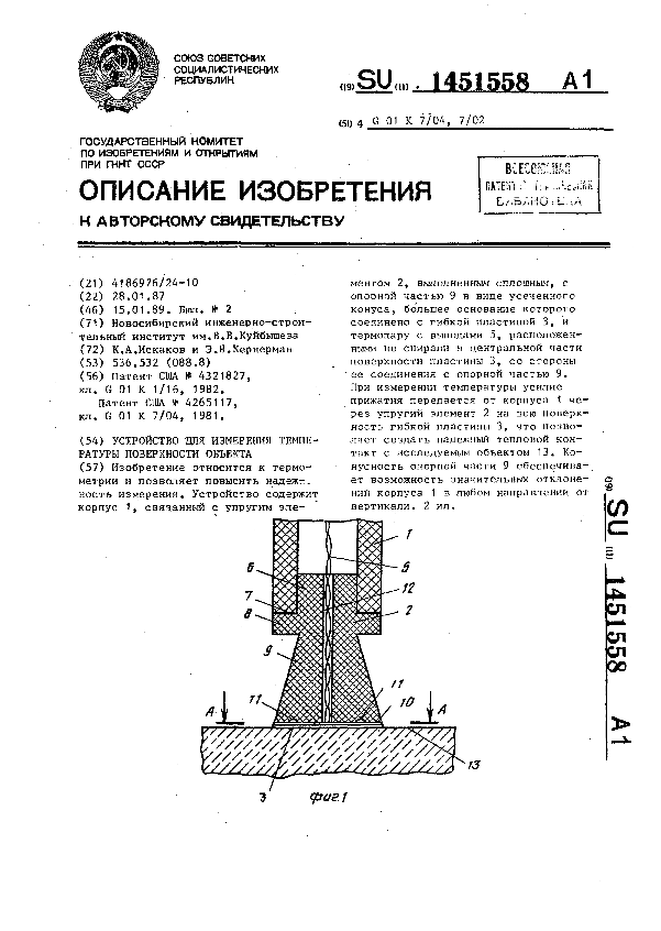 Устройство для измерения температуры поверхности объекта / Искаков К. А., Кернерман Э. Я.; заявитель: Новосибирский инженерно-строительный институт им. В. В. Куйбышева // Описания изобретений (ретрофонд) / Комитет по патентам и товарным знакам России. – М., 2003. – 1989, № 1. — (Патенты России). — Загл. с титул. экрана. — Поисковая система: ИПС MIMOSA GTI. — Систем. требования: Acrobat Reader. — Режим доступа: ftp://smolensklib.ru/bd/patent_ru/pt1451558.pdf. — <URL:ftp://smolensklib.ru/bd/patent_ru/pt1451558.pdf>.