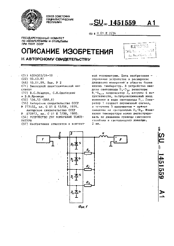 Устройство для измерения температуры / Осадчук В. С., Одобецкий С. И., Яремчук В. Ф.; заявитель: Винницкий политехнический институт // Описания изобретений (ретрофонд) / Комитет по патентам и товарным знакам России. – М., 2003. – 1989, № 1. — (Патенты России). — Загл. с титул. экрана. — Поисковая система: ИПС MIMOSA GTI. — Систем. требования: Acrobat Reader. — Режим доступа: ftp://smolensklib.ru/bd/patent_ru/pt1451559.pdf. — <URL:ftp://smolensklib.ru/bd/patent_ru/pt1451559.pdf>.