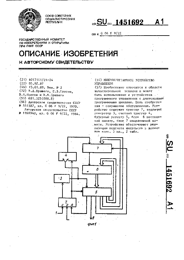 Микропрограммное устройство управления / Кривего В. А., Глонти Е. В., Полеха В. А., Кривего В. В. // Описания изобретений (ретрофонд) / Комитет по патентам и товарным знакам России. – М., 2003. – 1989, № 1. — (Патенты России). — Загл. с титул. экрана. — Систем. требования: Acrobat Reader. — Режим доступа: ftp://smolensklib.ru/bd/patent_ru/pt1451692.pdf. — <URL:ftp://smolensklib.ru/bd/patent_ru/pt1451692.pdf>.