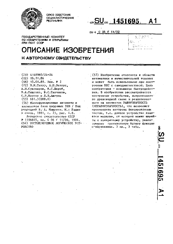 Тестопригодное логическое устройство / Татур М. М., Белоус А. И., Сухопаров А. И. [и др.]; заявитель: Минское высшее инженерное зенитное ракетное училище противовоздушной обороны // Описания изобретений (ретрофонд) / Комитет по патентам и товарным знакам России. – М., 2003. – 1989, № 1. — (Патенты России). — Загл. с титул. экрана. — Систем. требования: Acrobat Reader. — Режим доступа: ftp://smolensklib.ru/bd/patent_ru/pt1451695.pdf. — <URL:ftp://smolensklib.ru/bd/patent_ru/pt1451695.pdf>.