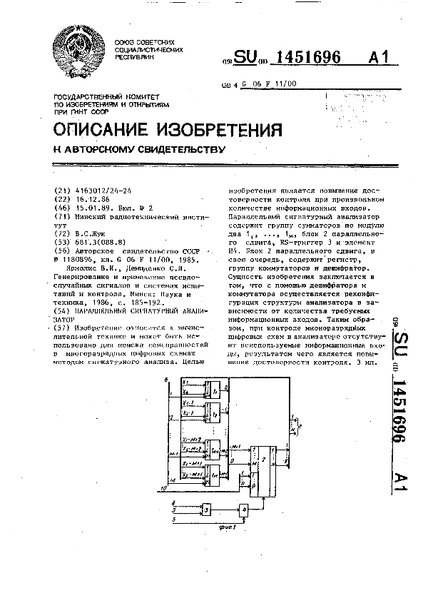 Параллельный сигнатурный анализатор / Жук В. С.; заявитель: Минский радиотехнический институт // Описания изобретений (ретрофонд) / Комитет по патентам и товарным знакам России. – М., 2003. – 1989, № 1. — (Патенты России). — Загл. с титул. экрана. — Систем. требования: Acrobat Reader. — Режим доступа: ftp://smolensklib.ru/bd/patent_ru/pt1451696.pdf. — <URL:ftp://smolensklib.ru/bd/patent_ru/pt1451696.pdf>.