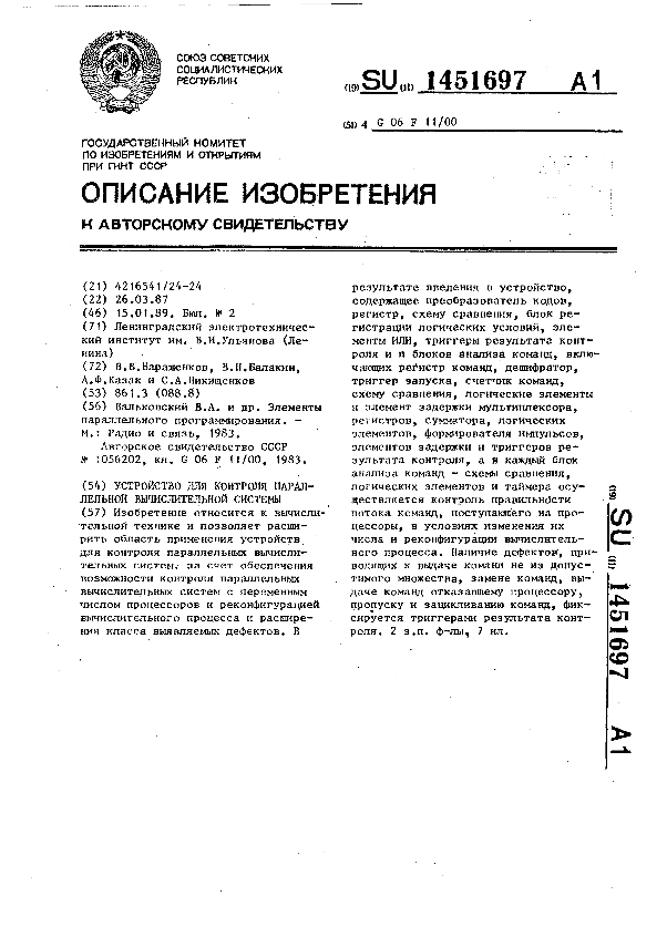 Устройство для контроля параллельной вычислительной системы / Барашенков В. В., Балакин В. Н., Казак А. Ф., Никищенков С. А.; заявитель: Ленинградский электротехнический институт им. В. И. Ульянова (Ленина) // Описания изобретений (ретрофонд) / Комитет по патентам и товарным знакам России. – М., 2003. – 1989, № 1. — (Патенты России). — Загл. с титул. экрана. — Систем. требования: Acrobat Reader. — Режим доступа: ftp://smolensklib.ru/bd/patent_ru/pt1451697.pdf. — <URL:ftp://smolensklib.ru/bd/patent_ru/pt1451697.pdf>.