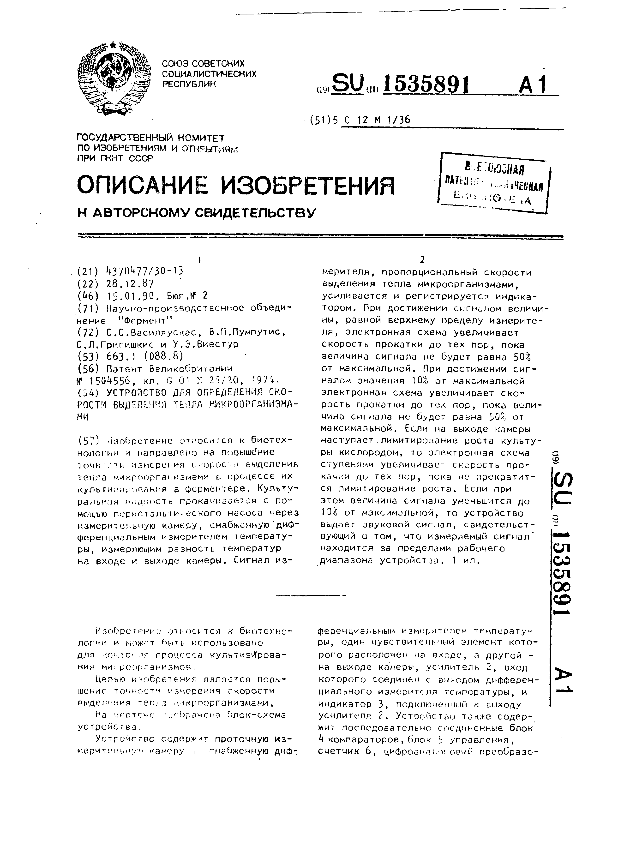 Устройство для определения скорости выделения тепла микроорганизмами / Василяускас С. С., Пумпутис В. П., Григишкис С. Л., Виестур У. Э.; заявитель: Научно-производственное объединение "Фермент" // Описания изобретений (ретрофонд) / Комитет по патентам и товарным знакам России. – М., 2003. – 1990, 1. — (Патенты России). — Загл. с титул. экрана. — Систем. требования: Acrobat Reader. — Режим доступа: ftp://smolensklib.ru/bd/patent_ru/pt1535891.pdf. — <URL:ftp://smolensklib.ru/bd/patent_ru/pt1535891.pdf>.