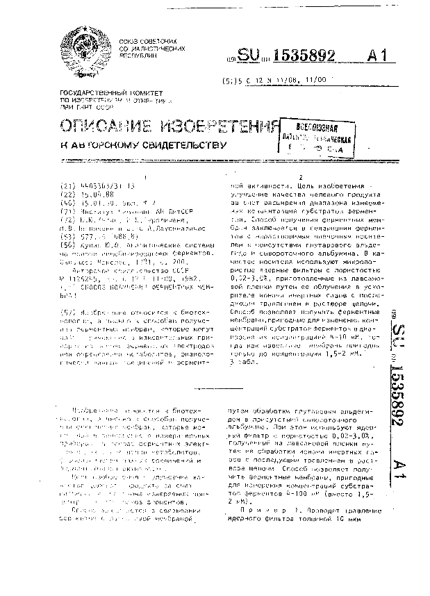 Способ получения ферментных мембран / Кулис Ю. Ю., Гурявичене В. В., Песлякене М. В., Лауринавичюс В.-С. А.; заявитель: Институт биохимии АН ЛитССР // Описания изобретений (ретрофонд) / Комитет по патентам и товарным знакам России. – М., 2003. – 1990, 1. — (Патенты России). — Загл. с титул. экрана. — Систем. требования: Acrobat Reader. — Режим доступа: ftp://smolensklib.ru/bd/patent_ru/pt1535892.pdf. — <URL:ftp://smolensklib.ru/bd/patent_ru/pt1535892.pdf>.